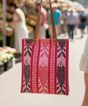 Elevate your everyday ensemble with this handcrafted canvas tote bag, a perfect blend of traditional artistry and modern functionality. Featuring a Bengal fish motif Handloom fabric in front with plain black cotton canvas in back, this tote embodies the rich heritage of Indian craftsmanship. The leather handles not only add a touch of elegance but also ensure durability for daily use.
