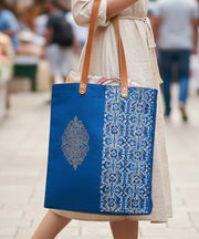 Elevate your everyday ensemble with this handcrafted canvas tote bag, a perfect blend of traditional artistry and modern functionality. Featuring a nice teal backdrop adorned with intricate golden hand block prints, this tote embodies the rich heritage of Indian craftsmanship. The leather handles not only add a touch of elegance but also ensure durability for daily use.