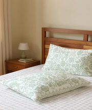 This off white with greyish green cotton jacquard bedcover has a floral pattern design running on the foot side of the bedcover. Both pillow cases are made from the same floral pattern design to add an exclusive designer look to this bedcover.