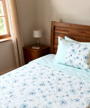 This sky blue & white bedcover has printed panel in the center & yarn dye stripe fabric attached on both the sides. It has 1 pc bedcover and 2 pcs pillow covers.