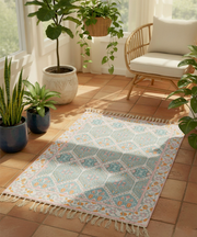 Bring a breath of serene elegance into your home. This beautiful cotton rug captures the tranquil spirit of a sunlit Indian courtyard, where intricate turquoise patterns adorn cool, cream-colored tiles. The design is a modern tribute to timeless architectural motifs, reimagined to bring a sense of peace and artistry to your living space.