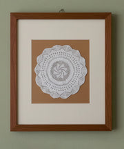 Featuring a circular “dollie” design crafted by hand, the white crochet pattern symbolizes purity and understated sophistication, making it a versatile art piece for any décor style. The minimal wooden frame complements the design, drawing attention to the fine details of the textile itself.