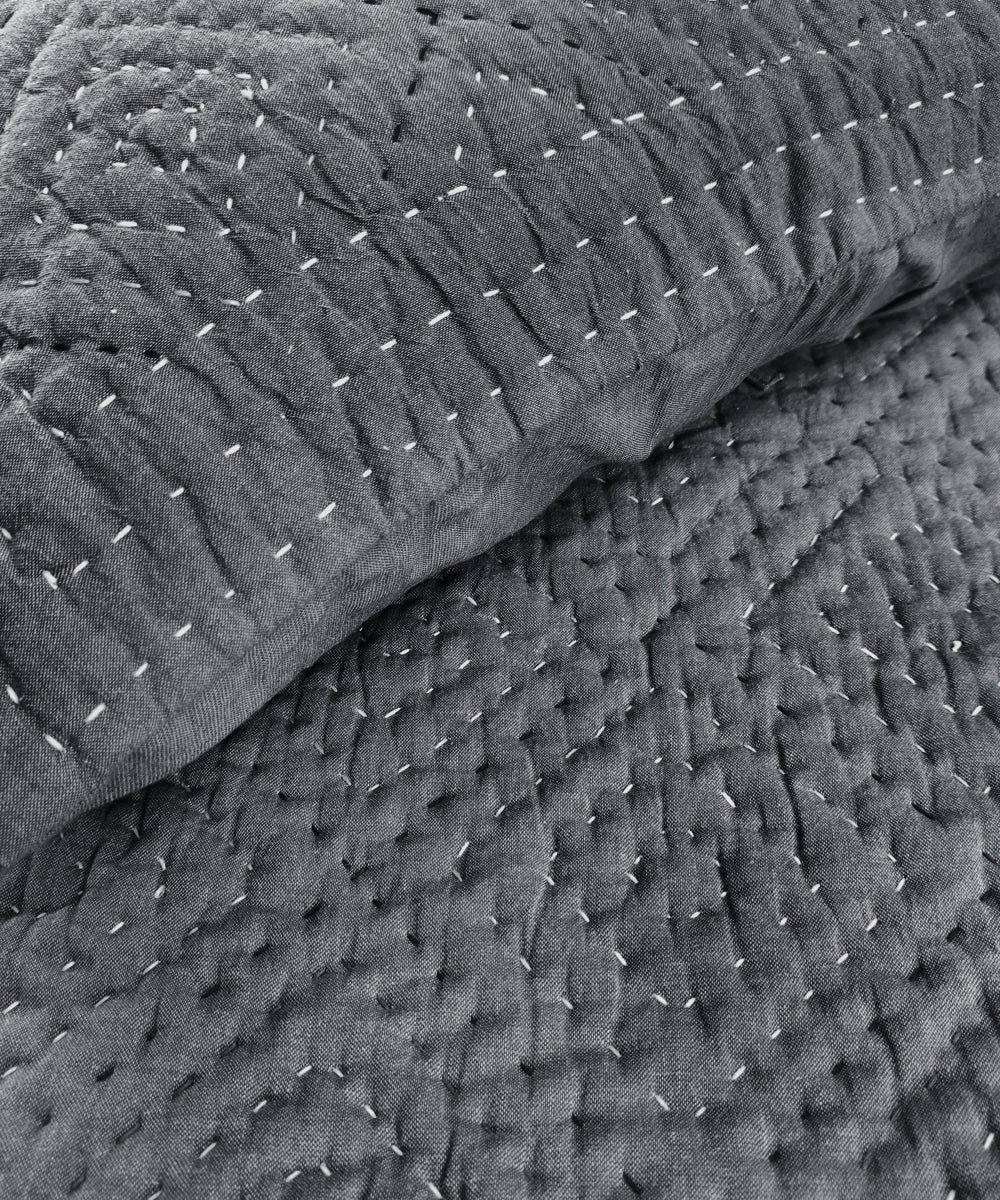 This is a hand quilted bedcover with rhombus pattern quilting & cotton filing inside. It comes with 2 pillow covers. Fabric is greyish blue cotton chambray. Durable & Ultra Soft.